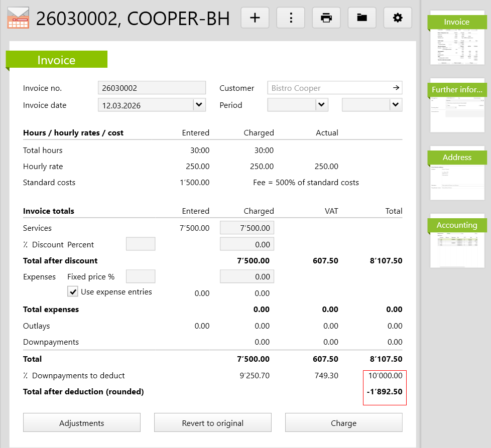 As soon as an invoice is created on a project, any downpayments already invoiced are deducted from this invoice as downpayments made.