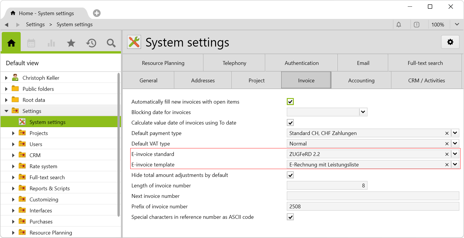 The default settings for creating e-invoices can be defined in the system settings in the Invoice tab: