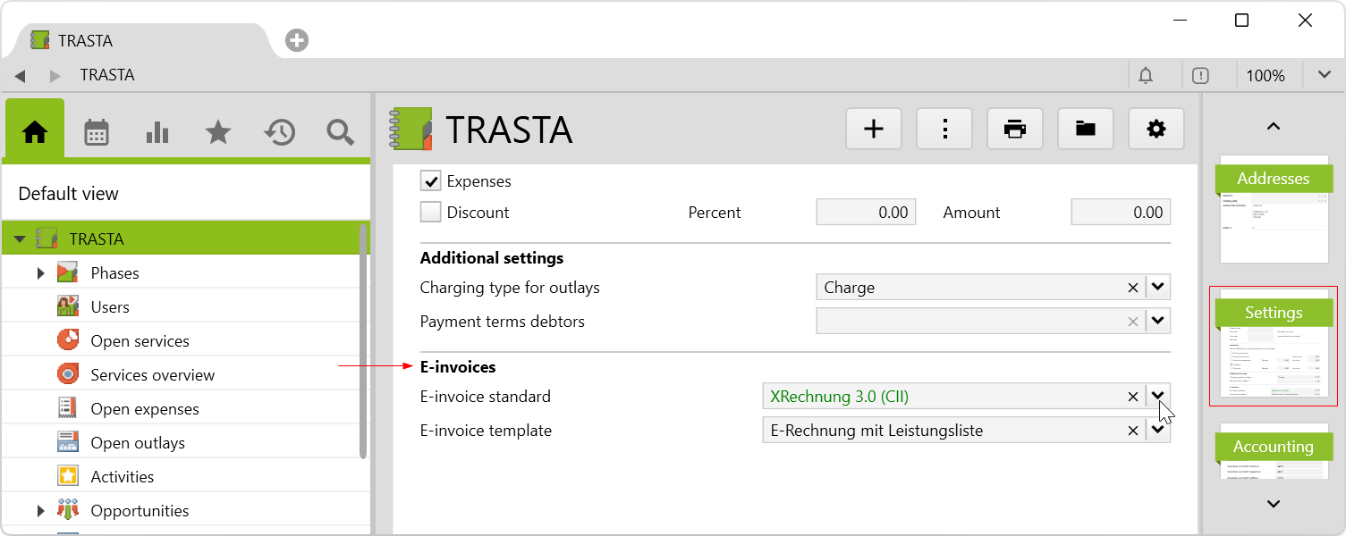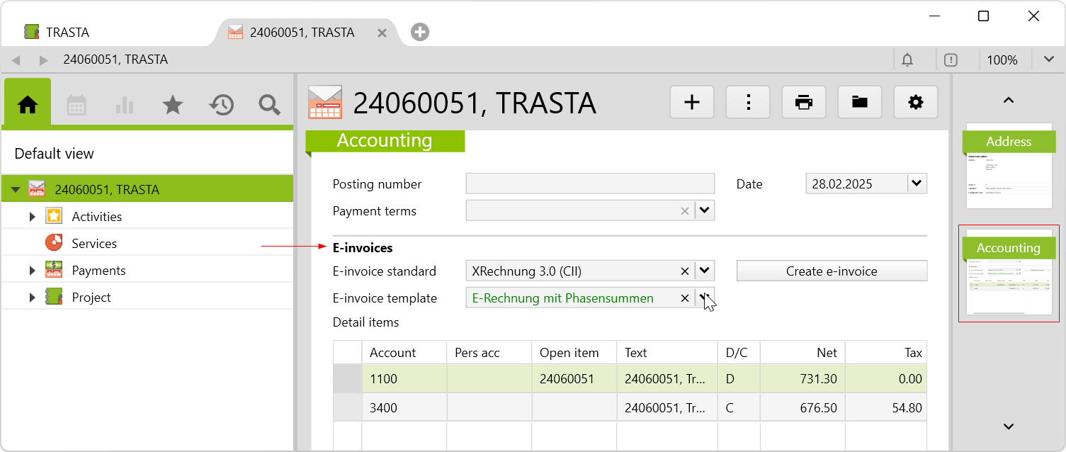 To create an e-invoice, an e-invoice standard and an e-invoice template must be defined on the corresponding invoice on the Accounting page. In addition, the following values must be defined: