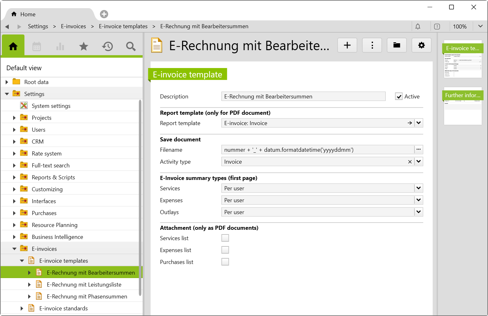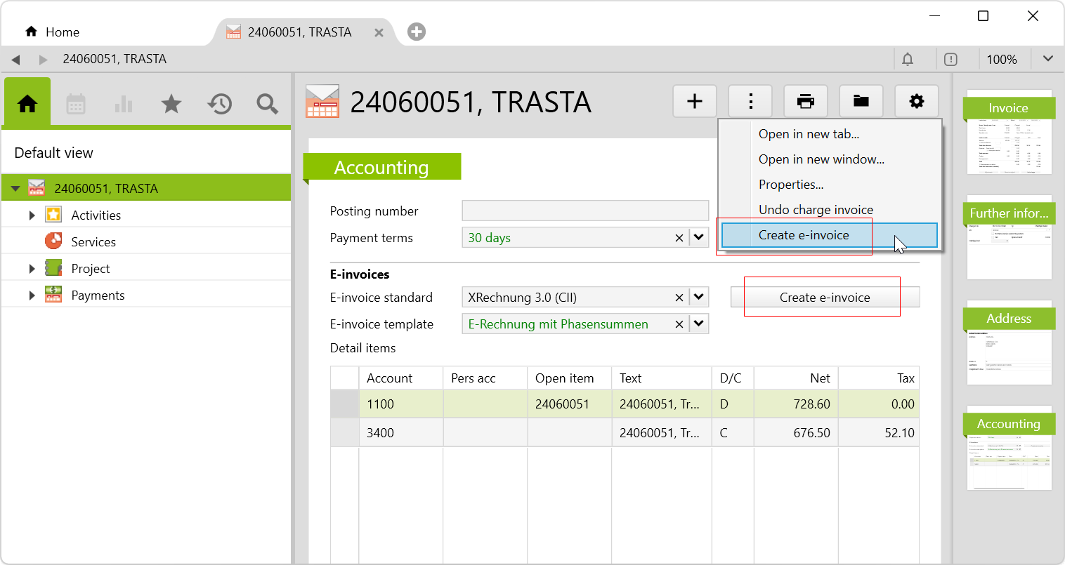 E-invoices are strictly formatted, structured and electronically available data sets with certain format, content and structure specifications. With this additional feature, e-invoices (ZUGfERD and XRechnungen) can be instantly created according to individually customizable templates.