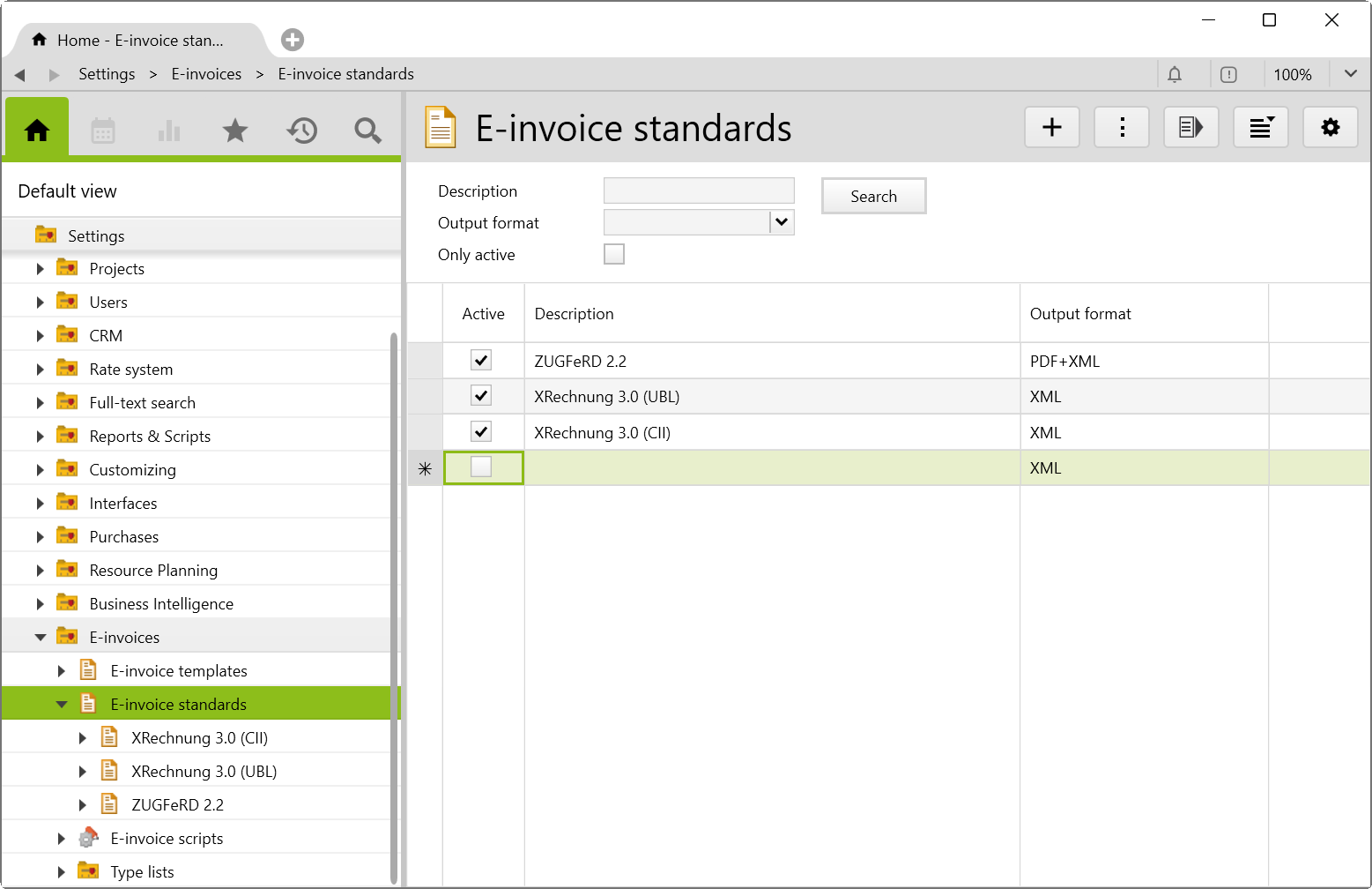 ![]() E-invoice standards can be deactivated, making them no longer available for selection. |