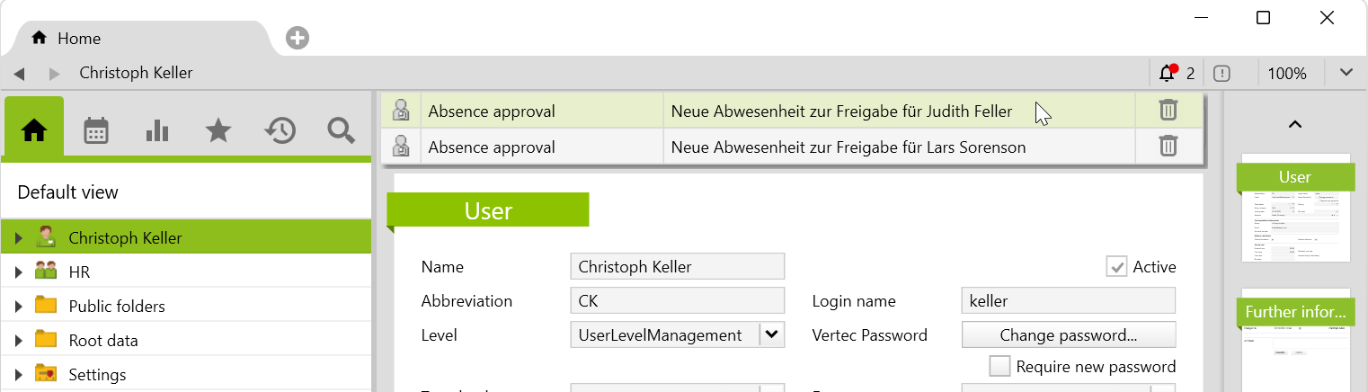 The user group allows the view of the HR root folder and has full read and write access to all users and their absences. It can activate all absences, regardless of the teamleader. The users must be assigned to the appropriate user groups . Note: If assigned to the HR folder access user group, teamleaders are able to approve the absences of their team members (if they have the teamleader right). The HR user group is not required for this purpose. The HR user group also grants permission to approve absences for other teams. |