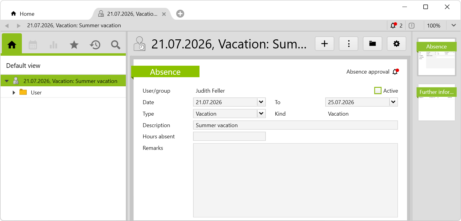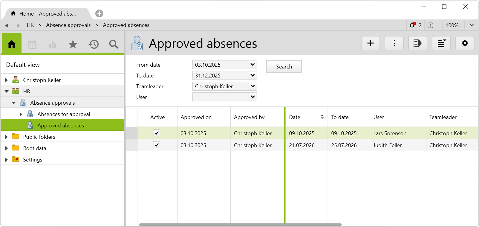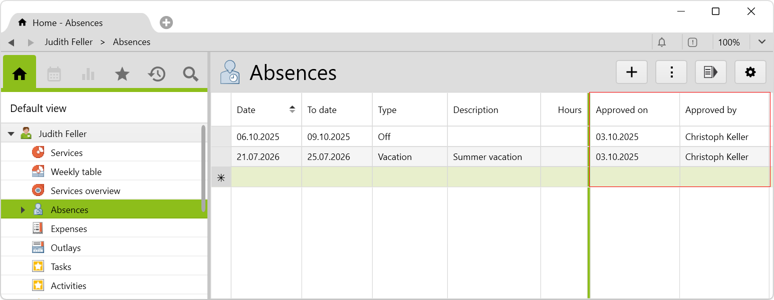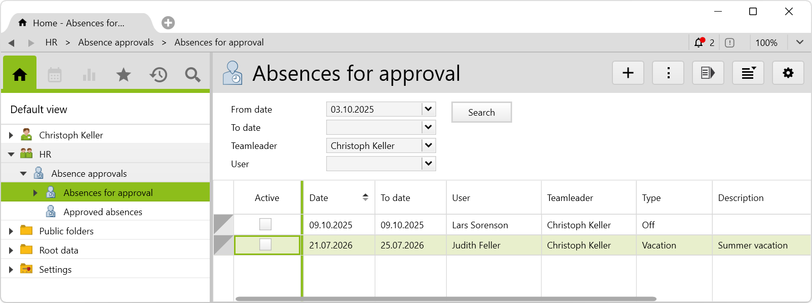 This additional feature implements a workflow for the approval of absences. Newly entered or changed absences are automatically assigned to inactive