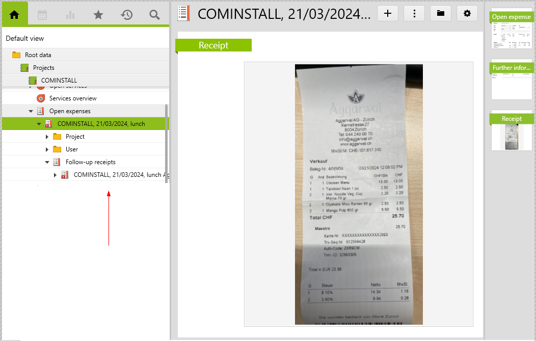 If different VAT rates are calculated on an expense receipt, another expense is created for each VAT rate in Vertec. These are linked to the current expense and can be found under follow-up receipts (or, in the reverse case, under original receipt):