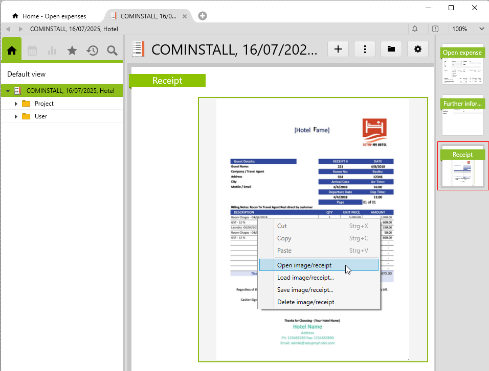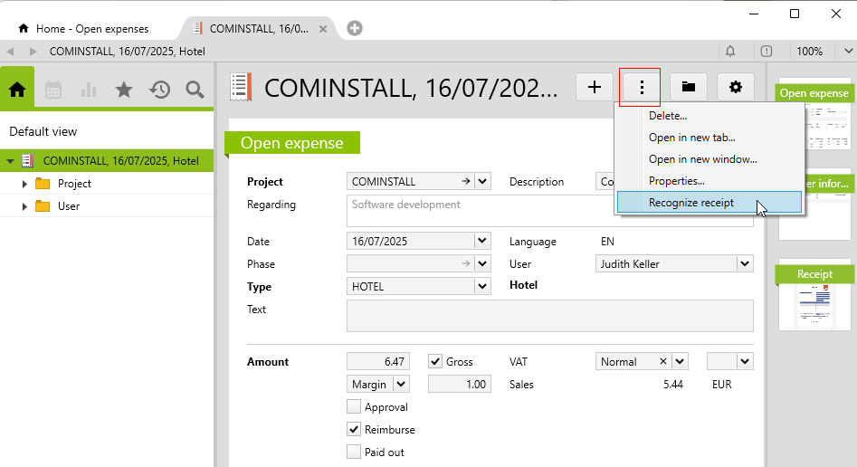 On the Receipt page, load the receipt via the right mouse button > Load image/receipt…. This triggers automatic receipt recognition, which is why loading takes a short while longer than usual. As soon as the recognition process is complete, the receipt appears and the values are entered on the expense. The date on the receipt is entered as the date.