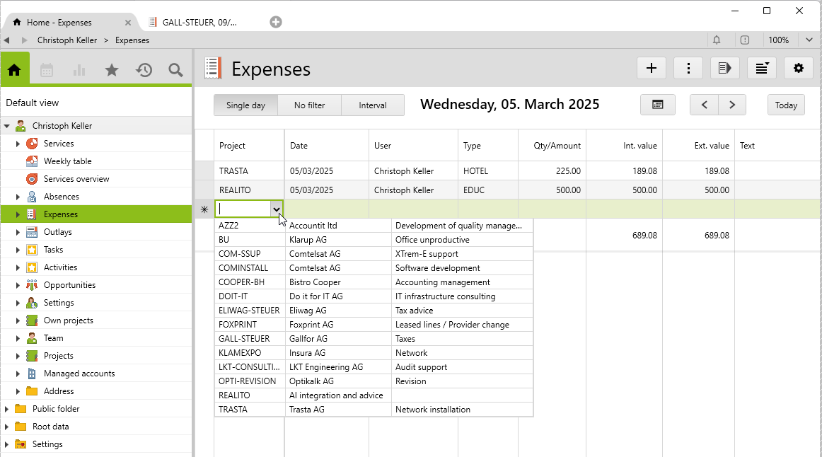 There are two options for price calculation: margin or price. ![]() MarginThe price calculation can be done by specifying a margin (as a factor). For example, if you want to hit a 5% margin on a price, specify 1.05 for margin. The Amount field specifies the actual purchase value. The amounts are calculated based on the margin. A margin can be predefined on the expense type. If a margin is specified, expenses entered on these types are calculated using the margin system. When allocating expense types to phases, the margins can be overwritten. These margins then apply to expenses and outlays that are entered for these phases. Gross checkbox: The checkbox indicates whether the amount is to be interpreted as gross or net. The margin is a factor that is always applied to the net value. Therefore, gross procurement is also possible with different VAT rates for procurement and sale. ![]() PriceThis calculation works according to the system of 5 units (quantity) at 15 francs (sales price) = 75 francs. For example, the purchase price is CHF 10.00 and the sales price is CHF 15.00. The amounts are calculated on the basis of these prices. Gross checkbox: This defines whether the price is to be interpreted as gross or net. The default value that a new expense assumes for the Gross field can be specified on the expense types (e.g., kilometers are always entered net, train tickets are gross). Because the purchase value is explicitly stated, there is a problem with the sales price calculation if the expenses are gross and the purchasing VAT is not equal to the sales VAT. In this case, the selling price is calculated on the basis of the gross purchase price, instead of the net price. ![]() |