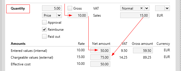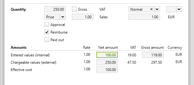 When you enter Quantity/Amount, the different amounts for internal, external, cost and VAT values are automatically calculated using the rates and the Gross checkbox. Vertec also allows the individual amounts to be entered directly. The amounts entered directly appear in green and are no longer affected by “quantity/amount”. All other amounts are calculated, if possible, on the basis of those entered directly, taking into account the amounts entered. ![]() Internal value vs. costUsually, the internal value and the cost value are the same. The cost value differs from the internal value only if you want to add an overhead surcharge to the price paid for the expense as part of cost accounting. In this case, a cost value is stored on the expense type, which then determines the costs on the expense. Adjust amounts for charged expensesThe purchasing VAT as well as the internal values can still be adjusted after charging. This is because they can still change, e.g. when paying out to the employee. If the expenses are part of a posted creditor entry, they can no longer be changed. |