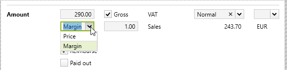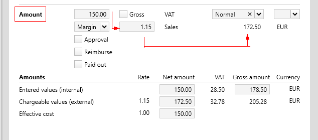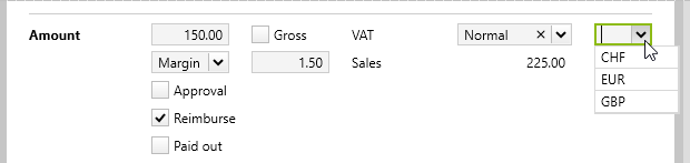 There are two options for price calculation: margin or price. ![]() MarginThe price calculation can be done by specifying a margin (as a factor). For example, if you want to hit a 5% margin on a price, specify 1.05 for margin. The Amount field specifies the actual purchase value. The amounts are calculated based on the margin. A margin can be predefined on the expense type. If a margin is specified, expenses entered on these types are calculated using the margin system. When allocating expense types to phases, the margins can be overwritten. These margins then apply to expenses and outlays that are entered for these phases. Gross checkbox: The checkbox indicates whether the amount is to be interpreted as gross or net. The margin is a factor that is always applied to the net value. Therefore, gross procurement is also possible with different VAT rates for procurement and sale. ![]() PriceThis calculation works according to the system of 5 units (quantity) at 15 francs (sales price) = 75 francs. For example, the purchase price is CHF 10.00 and the sales price is CHF 15.00. The amounts are calculated on the basis of these prices. Gross checkbox: This defines whether the price is to be interpreted as gross or net. The default value that a new expense assumes for the Gross field can be specified on the expense types (e.g., kilometers are always entered net, train tickets are gross). Because the purchase value is explicitly stated, there is a problem with the sales price calculation if the expenses are gross and the purchasing VAT is not equal to the sales VAT. In this case, the selling price is calculated on the basis of the gross purchase price, instead of the net price. ![]() |