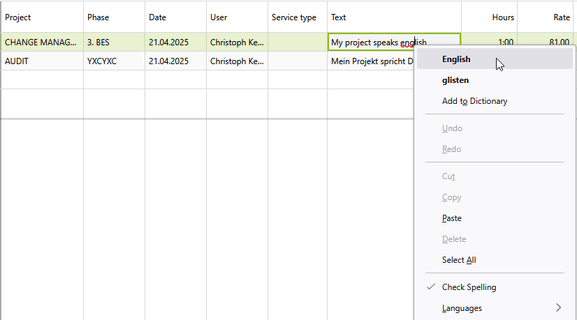 The spell checker, including the OCL expression project.language is activated by default for the Text column on lists of services, expenses and outlays.