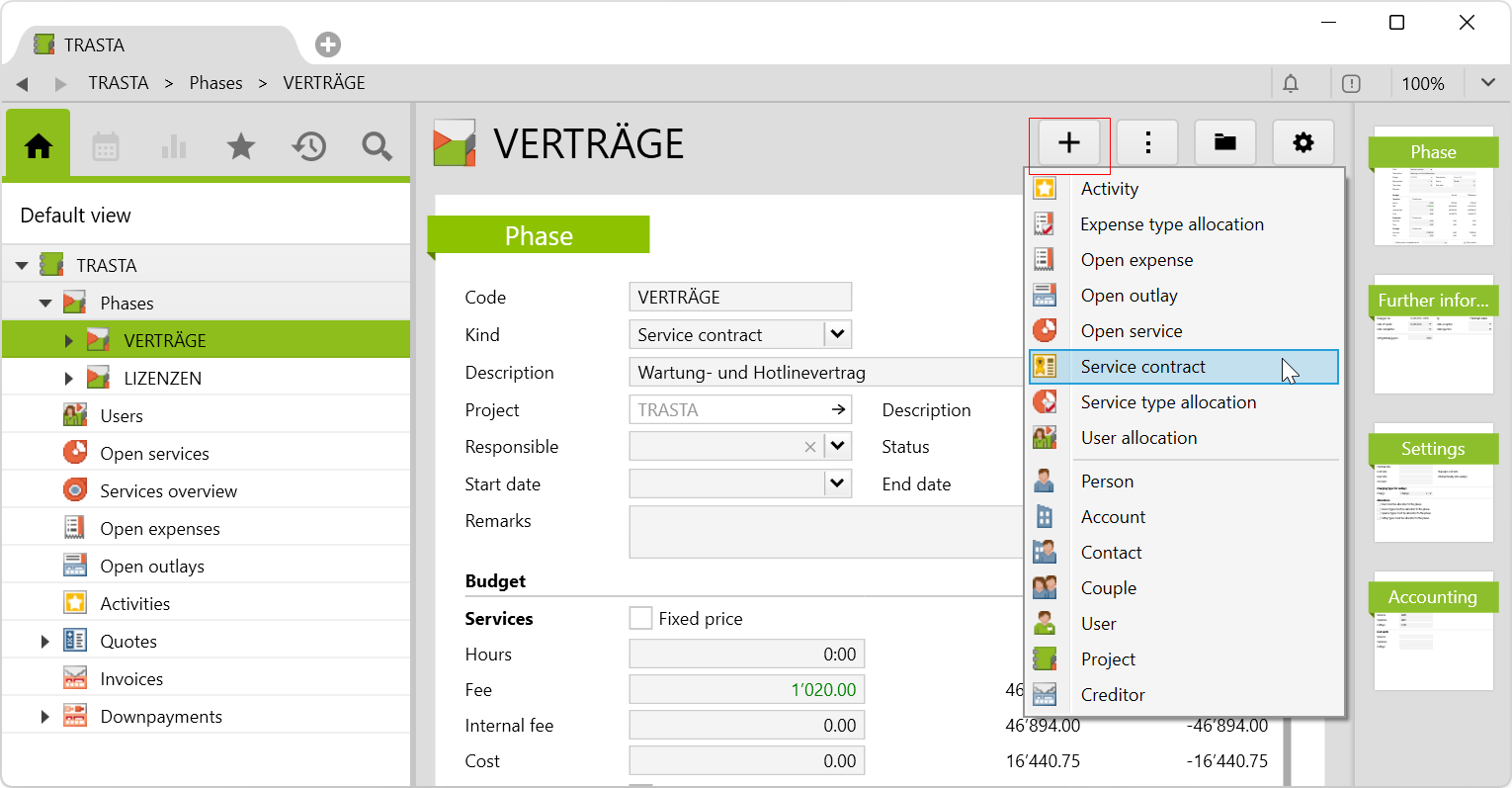 Depending on the type of phase, there are the entries on the phase in the new menu License sale or Service contract.