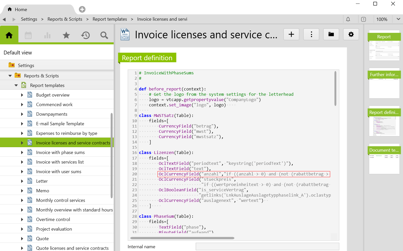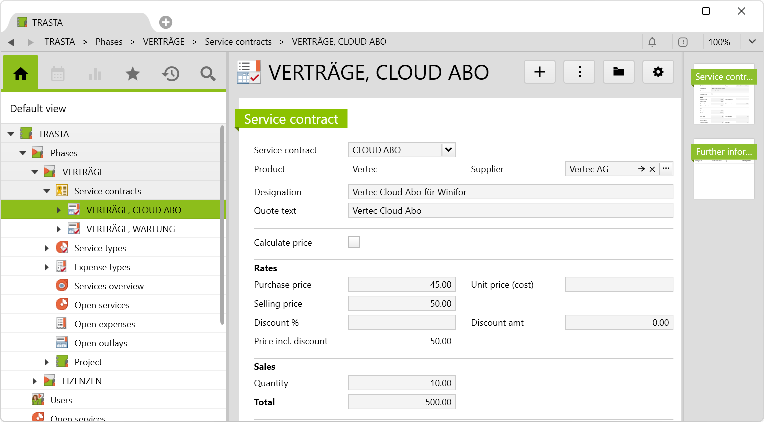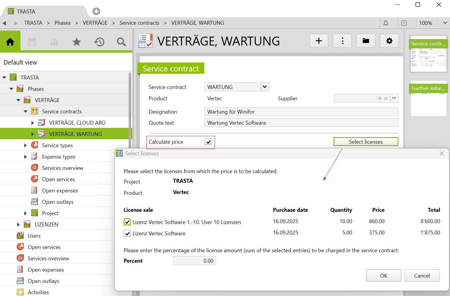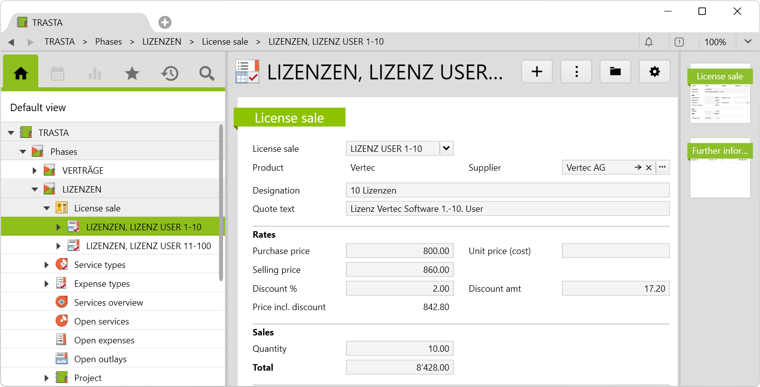 This additional feature complements Vertec with features for selling, managing and charging licenses and service agreements.