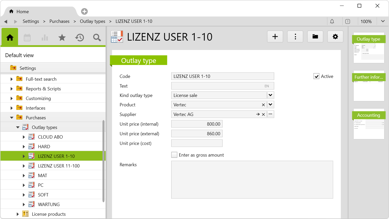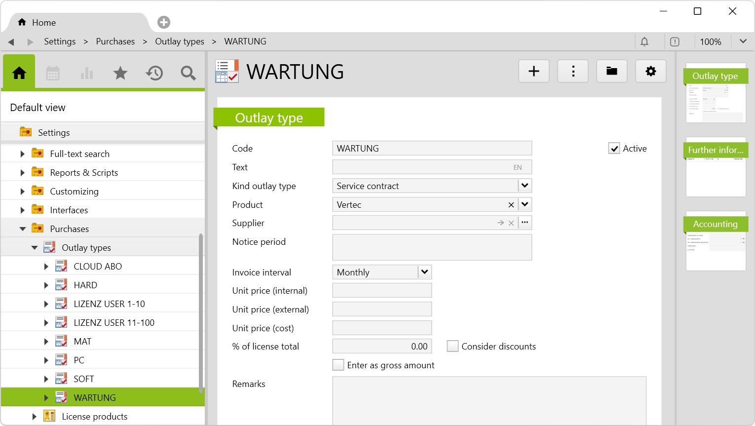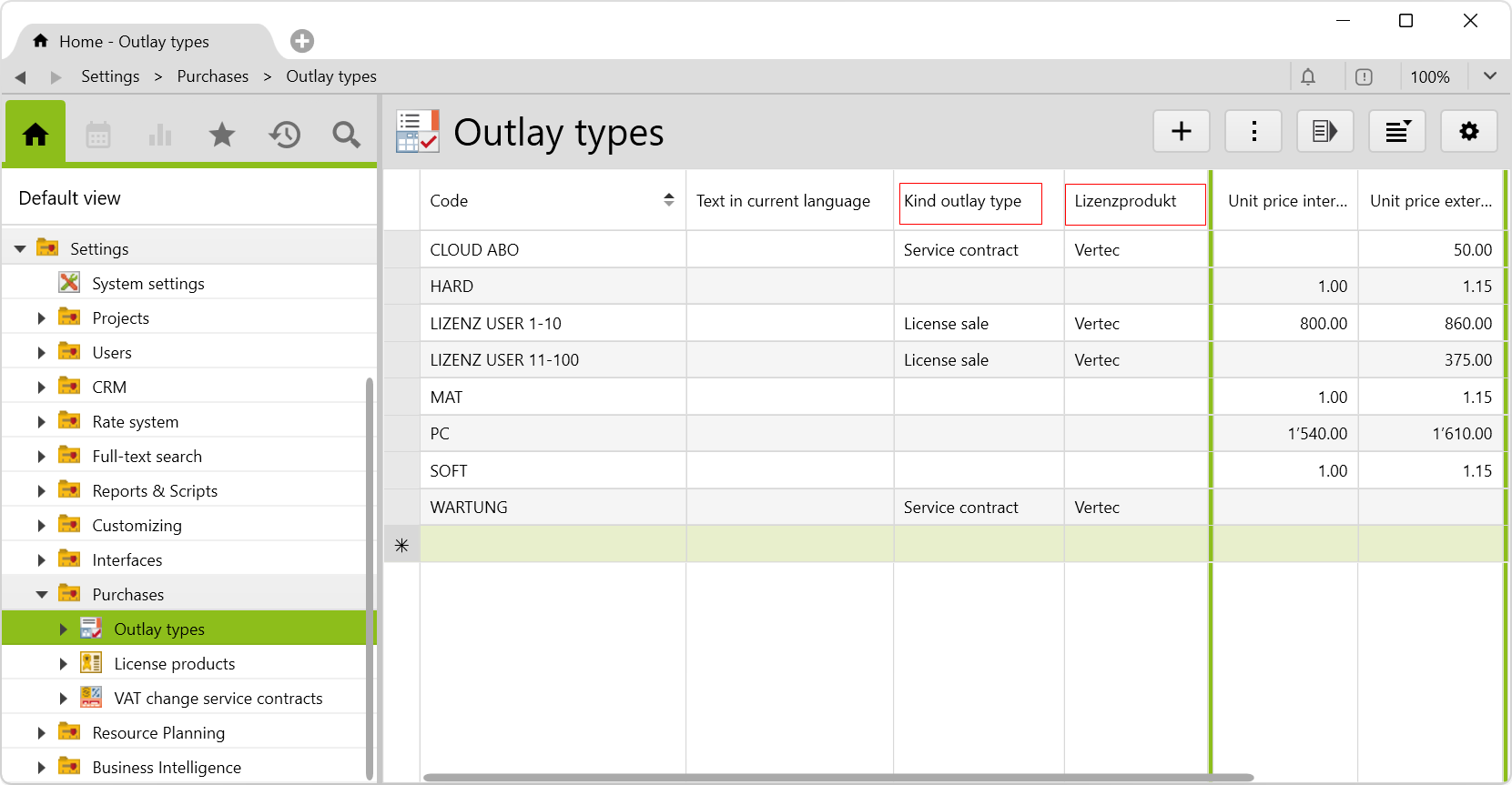 In order to sell licenses or conclude service contracts, it is necessary to create Outlay types on which the defined license products can be selected. This allows different types of contracts and licenses to be created for a licensed product.
