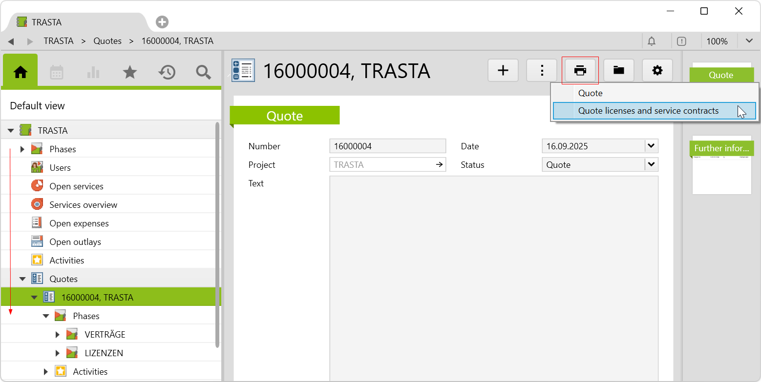 This config set comes with a report template that can be used to create and print or send quotes for licenses and service contracts. For that, create a quote on the project, assign the appropriate phases and select the option via print Quote licenses and service contracts: