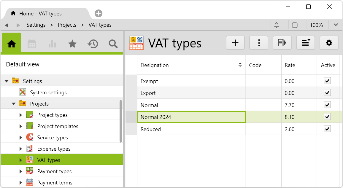Settings > Projects > VAT types, enter a new VAT type with rate 8.1, which applies from 01.01.2024: