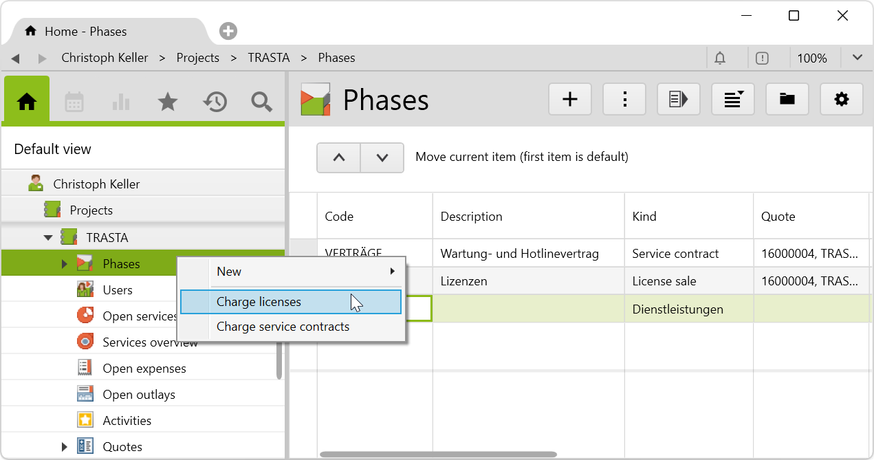 In order to sell or conclude a license or a service contract, a project (and if desired, a Offer) needs to be created. Therefore, the user must be User Group Project Leader assigned to the project manager user group. In addition, project Phase must be created assigning the project in which the type of project can be selected: License sale or Service contract. All other phases have the type Dienstleistungen and may not be used for license sales or service contracts.