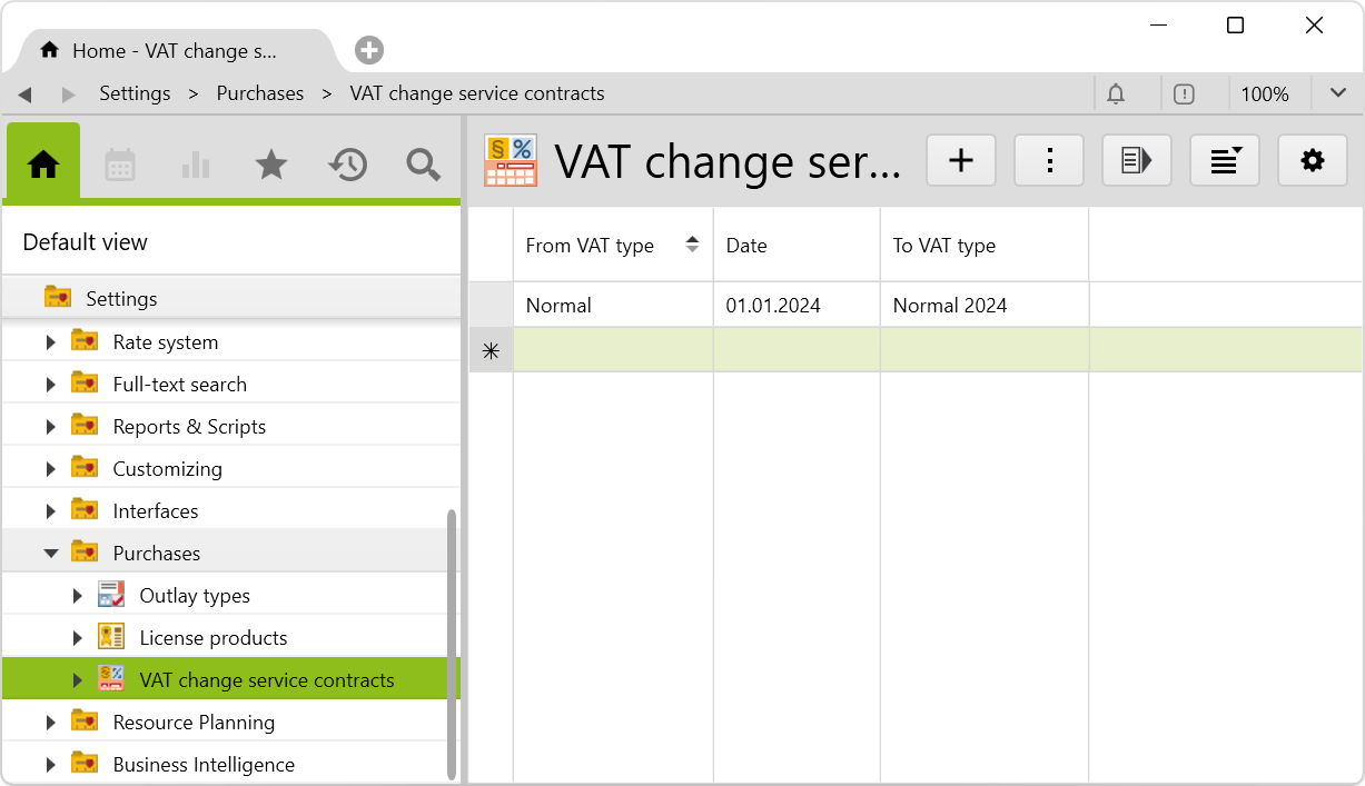 Settings > Purchases > VAT change service contracts, the current VAT type is filled in under To VAT type the new VAT type created under point 1, which applies from 2024 and as the date of 01.01.2024: