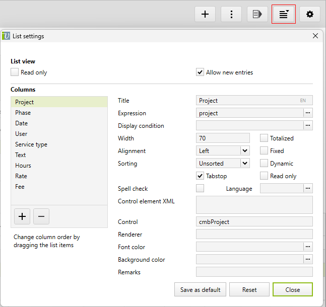 In the control name field, you can save the name of a control. For example, the list settings screenshot above shows the cmbProjekt control for the project column of the service list. The result is that this control appears in the list: ![]() You can find a list of all available controls here. |