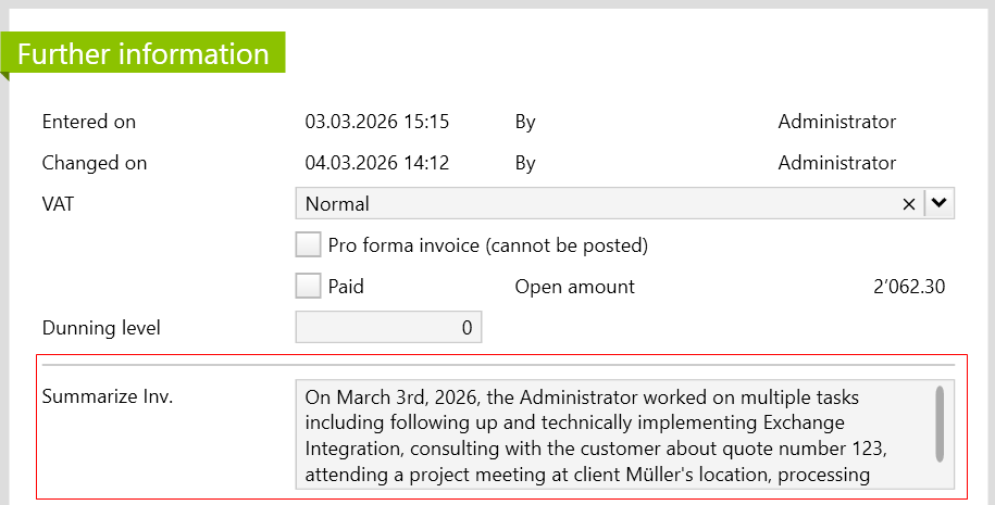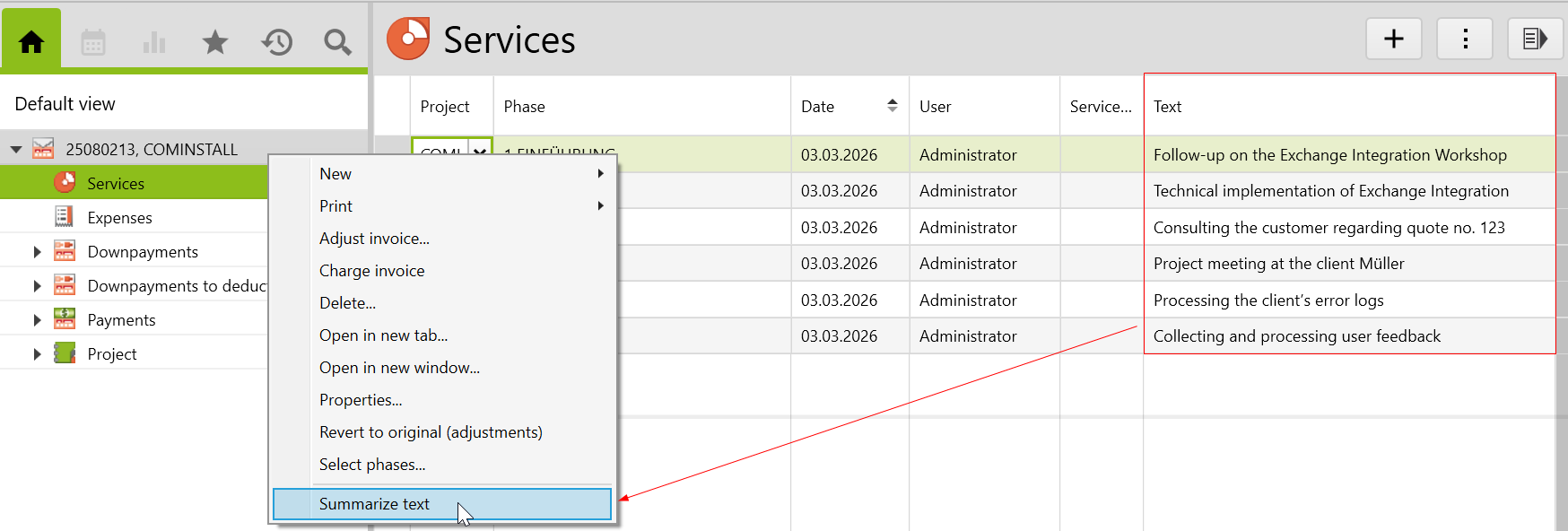 If a couple services and the corresponding texts were entered and then an invoice was created, the feature Summarize text should be available by right-clicking on the invoice or by navigating to the actions menu.