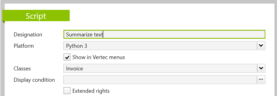 Then create a new script under Settings > Reports & Scripts > Script. In the script, name the feature with a suitable designation and select the platform Python 3. The module is also only compatible with Python 3. Afterwards, you tick the checkbox Show in Vertec menus so that the feature is ready to be run. Finally, select Invoice under Classes .