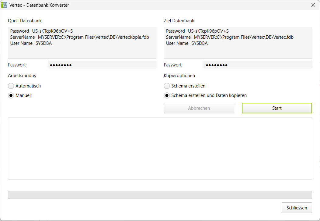 Start the convert. The white area of the main window shows the process. When the convert is complete, you can close the converter window. Now Vertec can start normally.