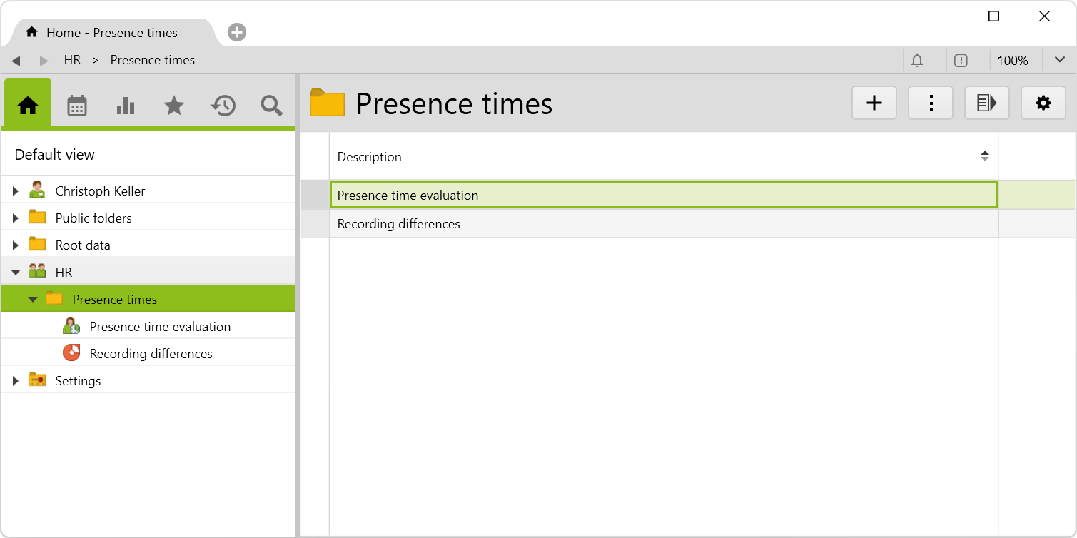 In the root folder HR, the presence times folder is created with the subfolders presence time evaluation and recording differences.