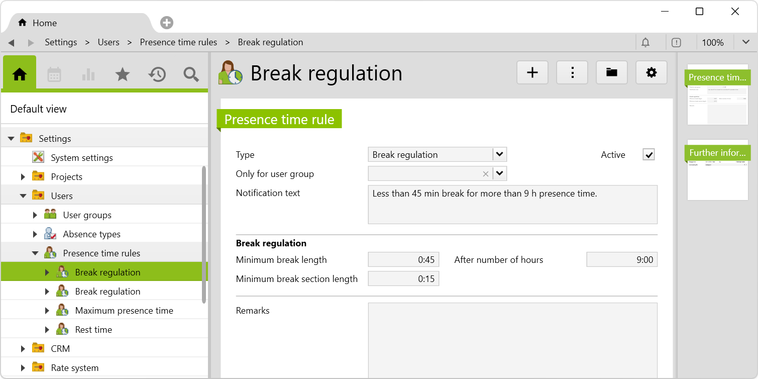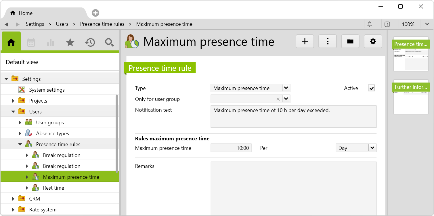The presence time rules can be managed in the root folder user in the settings (only by the administrator). The predefined rules correspond to the current working time law in Germany.