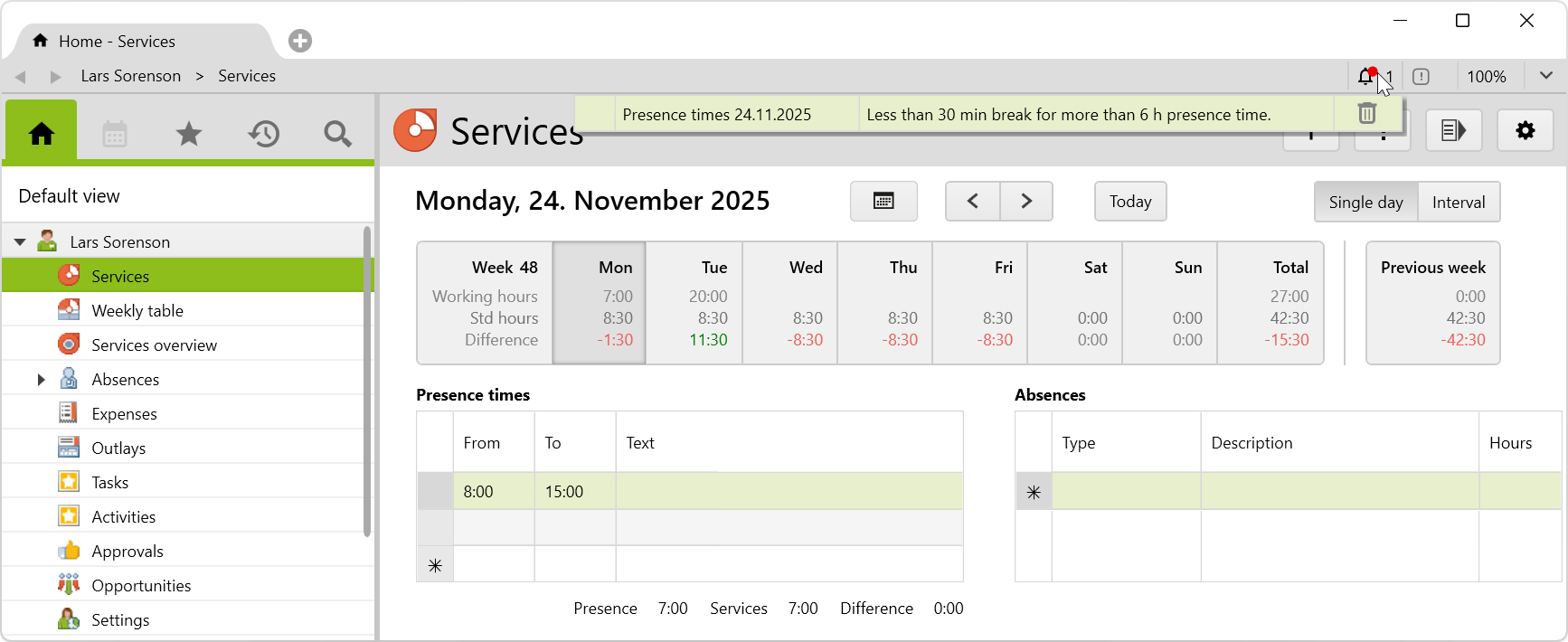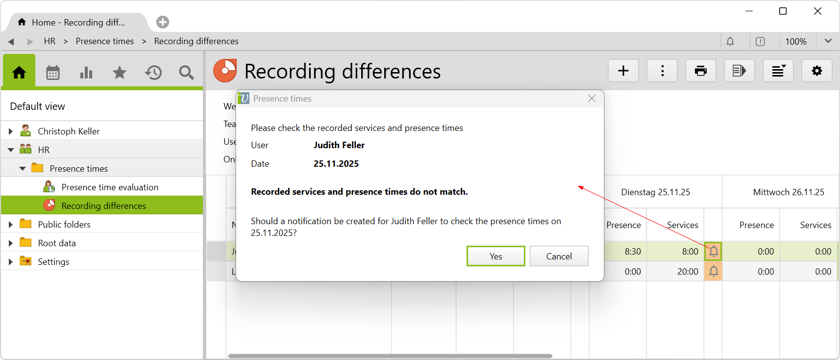 It is checked – in the past until today – whether these two data match, if a standard hour is entered. Here again, the red button signals discrepancies and the tooltip reads: Recorded services and presence times do not match. With a click on the button, the employee can be notified directly: