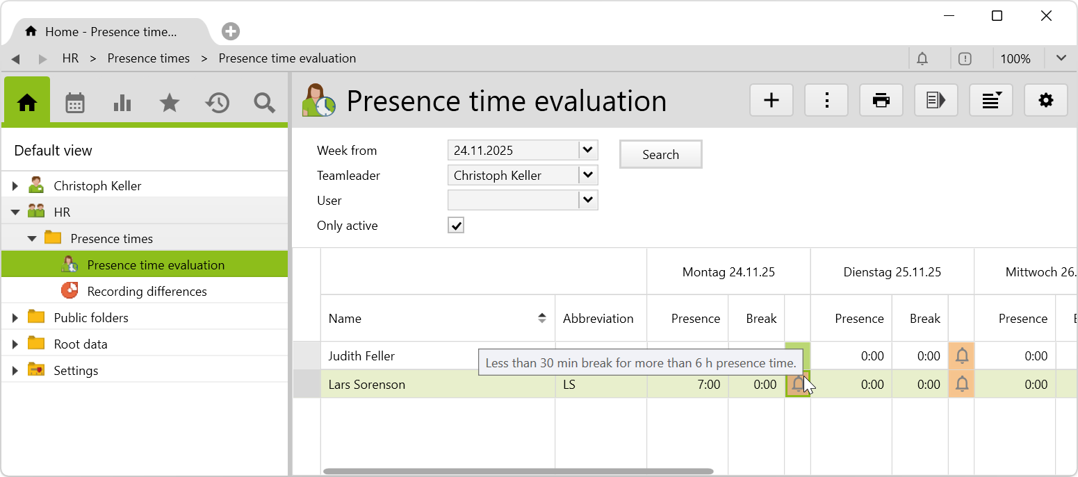 This folder shows an evaluation based on the configurable rules. The evaluation checks whether all presence time rules that apply to employees (team members) have been adhered to. A team leader sees all employees to whom he has been assigned as team leader. In addition, he must dispose team leader user rights.