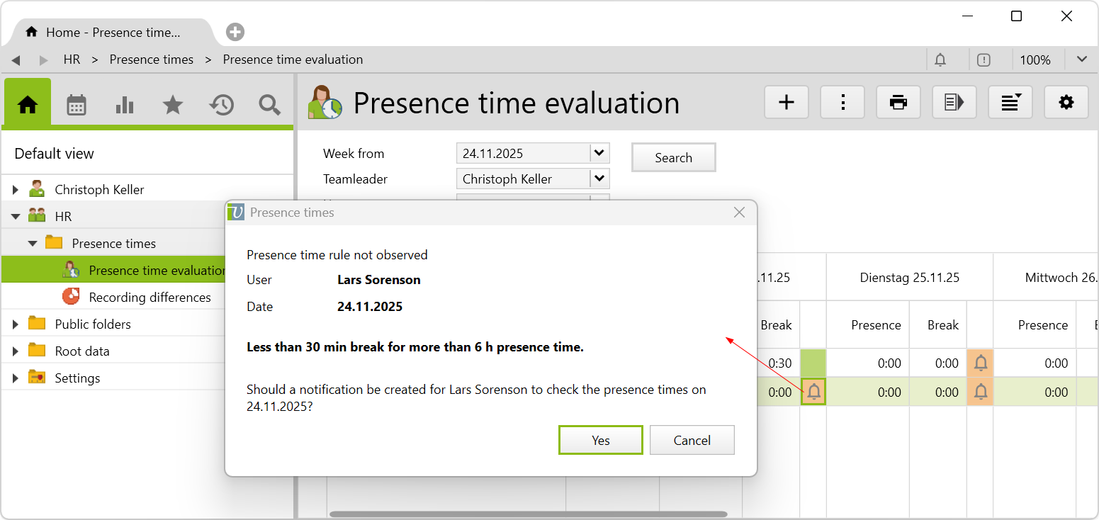 If all rules have been complied with, the day is highlighted in green. If a rule is broken, this day is highlighted in red and the corresponding employee can be notified directly via a button in the report. The report can be filtered by week, team leaders and users and shows a list of all presence times and breaks per day.