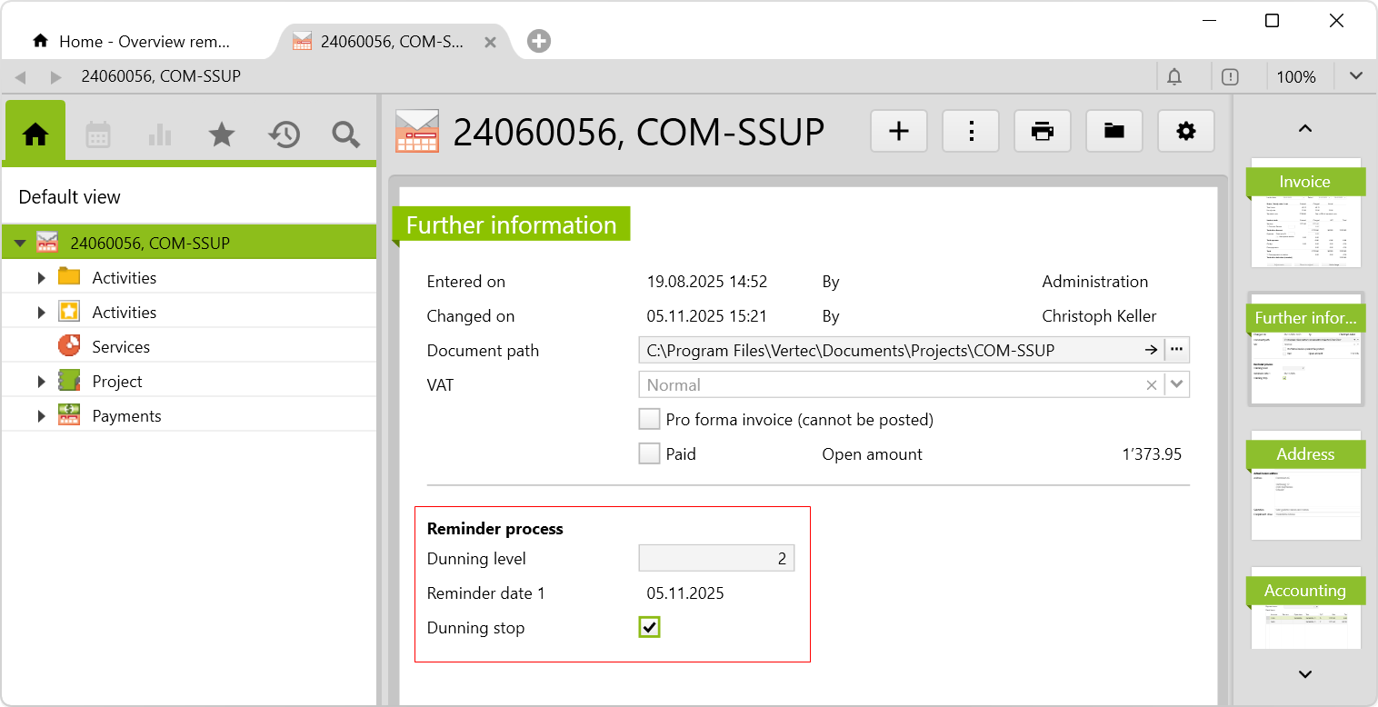 When the checkboxes Dunning stop or Paid are checked, the reminder disappears (after reloading) from the list overview reminders.