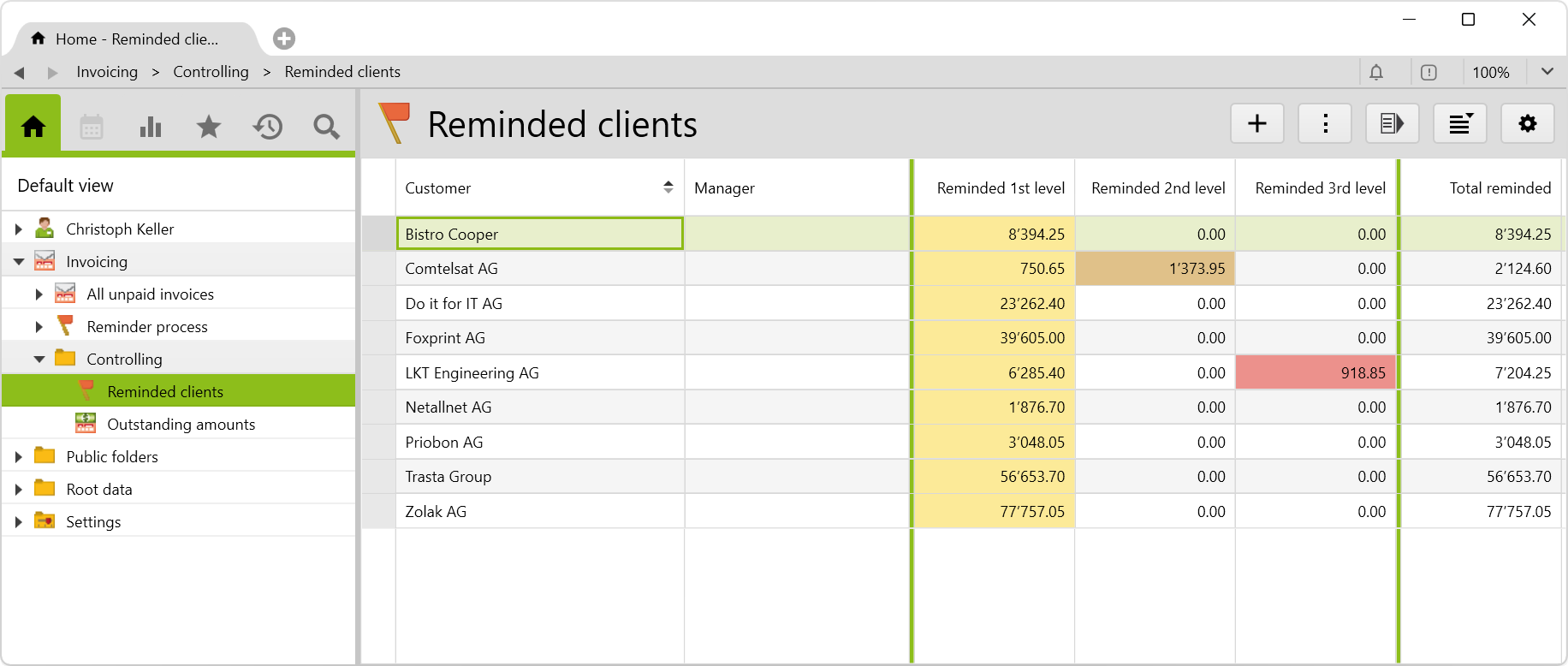 Reminded clients: Contains all customers who have at least one outstanding reminder. The three dunning levels are shown in different colours.Outstanding amounts: Contains all outstanding invoices, whether reminded or not.