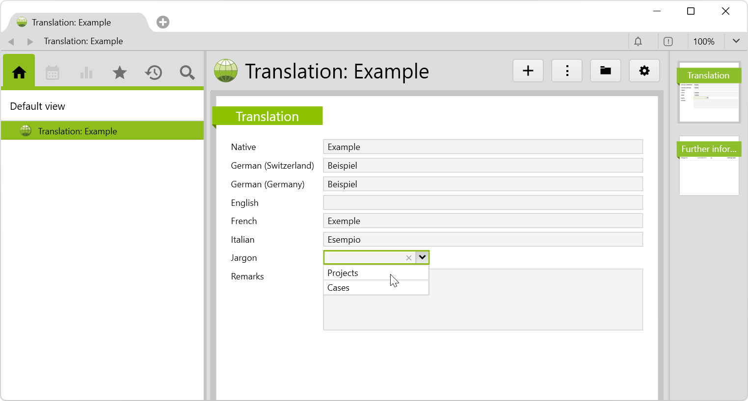 By default, each object created by Vertec contains an entry ID to distinguish them from objects created by customers. Therefore, these objects are not automatically translated.