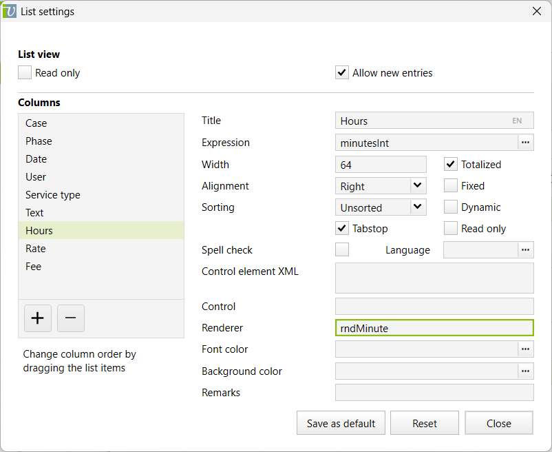 rndFeeRateFunctionality: Shows an hourly rate with two or four digits, depending on the system setting hourly rates are not rounded. Available from version 6.0: If this setting is not activated, four digits are shown if more than two decimal places are present, otherwise, two digits are shown. Use: For services with the values ansatzInt und ansatzExt. |
