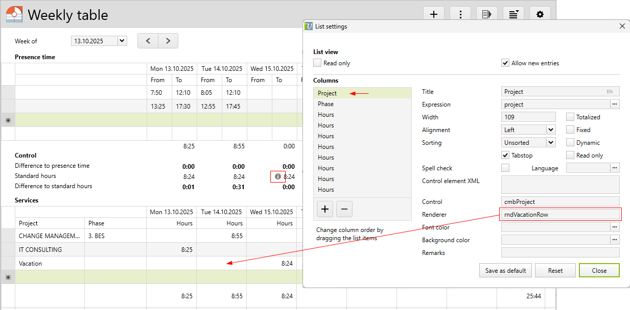 rndVacationRowFunctionality: For vacations from absences, a separate, non-writable row is shown in the weekly table. This renderer is needed in order for the vacation row to be recognizable as such. This is stored by default in the project column and shows vacation as text in the vacation row. It takes translations into account. ![]() |