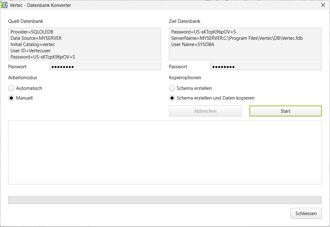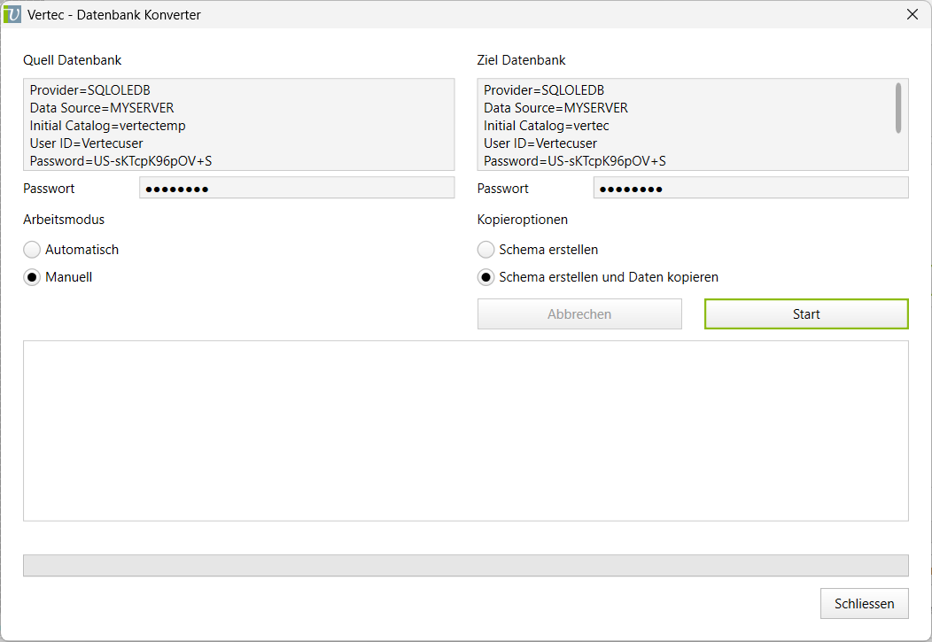 Durch Drücken des Start Buttons werden zuerst die Tabellen in der Zieldatenbank gelöscht und danach neu erzeugt. Anschliessend werden die Daten von der VertecTemp Datenbank in die Vertec Datenbank kopiert und dabei auf die neue Version konvertiert.