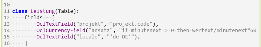 1. Es wird eine Referenz auf den Code angegeben, welcher als Ergebnis einen Ländercode enthält. Im Code wird dafür in der entsprechenden Table ein OclTextField mit dem angegebenen Namen (hier im Beispiel locale) eingefügt: